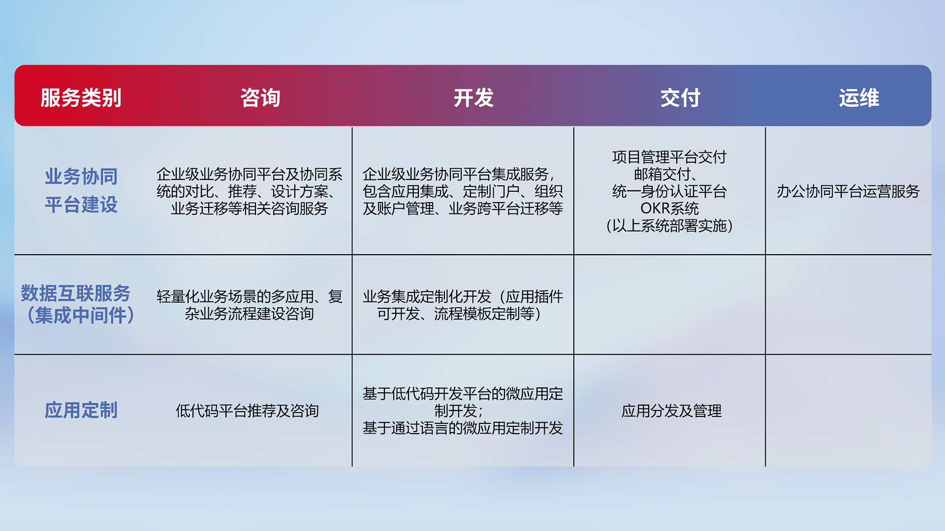 针对钉钉、、、、企微、、、、IDaas等平台级产品提供产品的规划、、、方案、、交付、、、、定制化开发等服务,,,实现如统一协同办公、、、、智能客户服务、、混合会议管理、、智能数据查询、、等业务场景,,,实现数字化转型。。。。